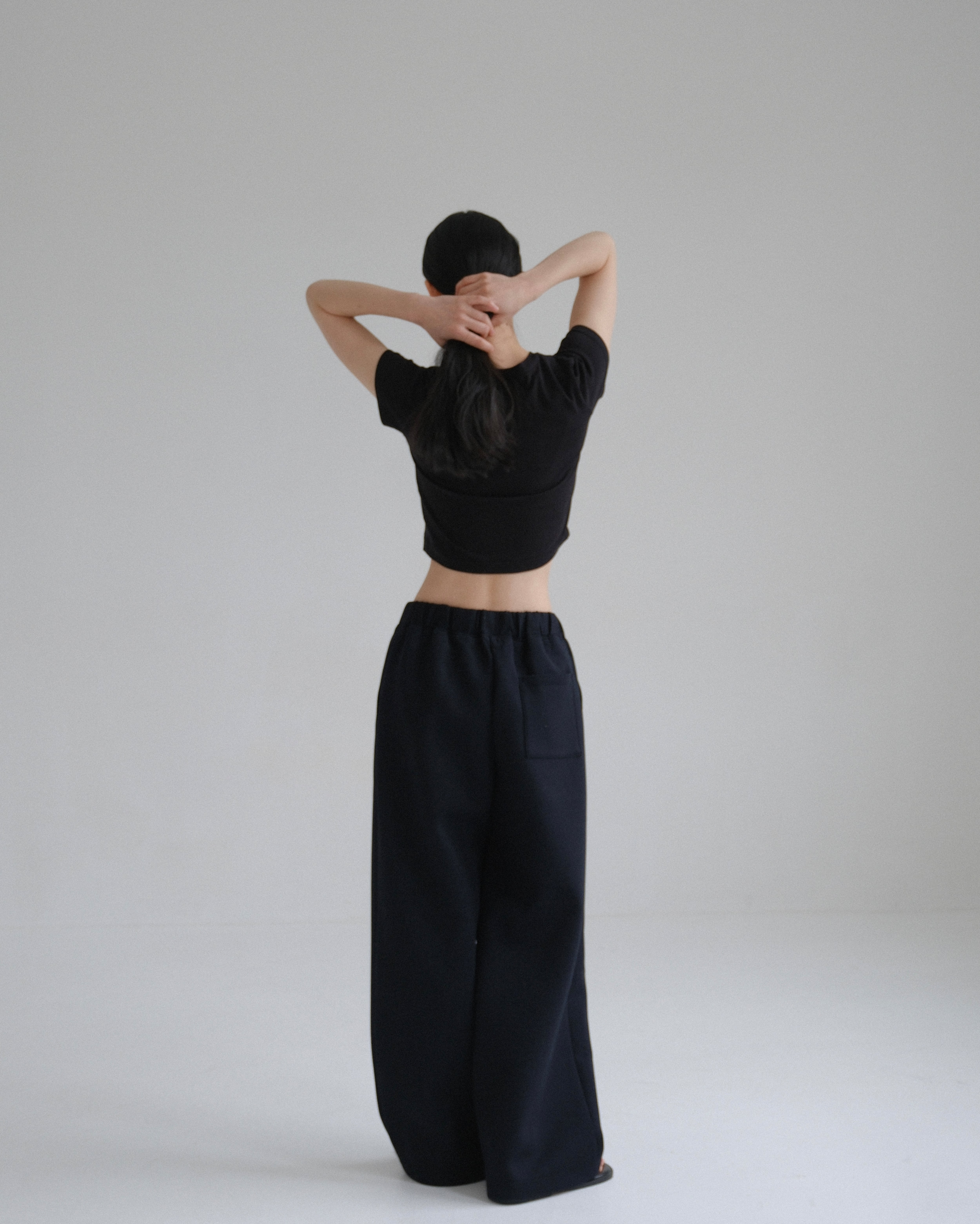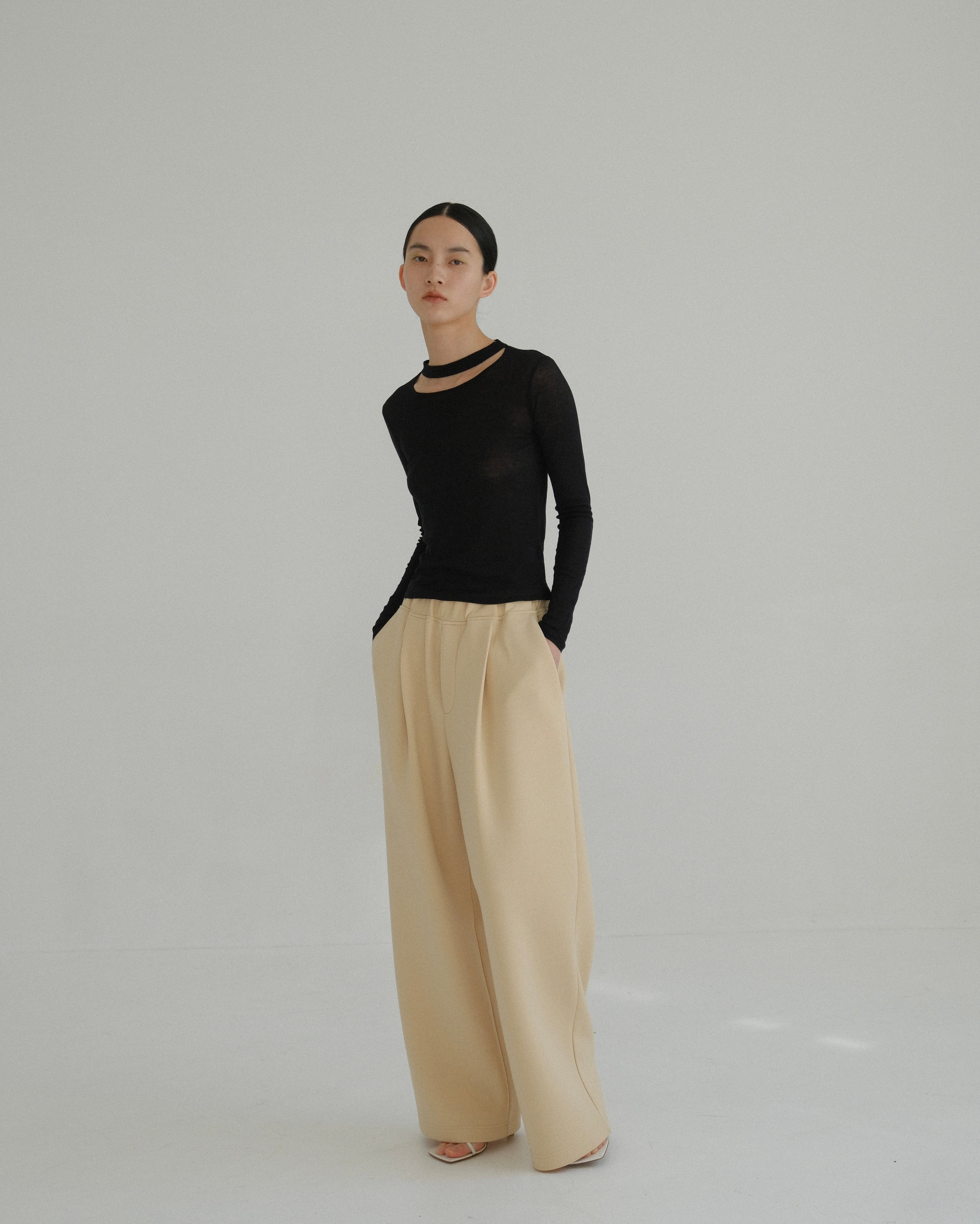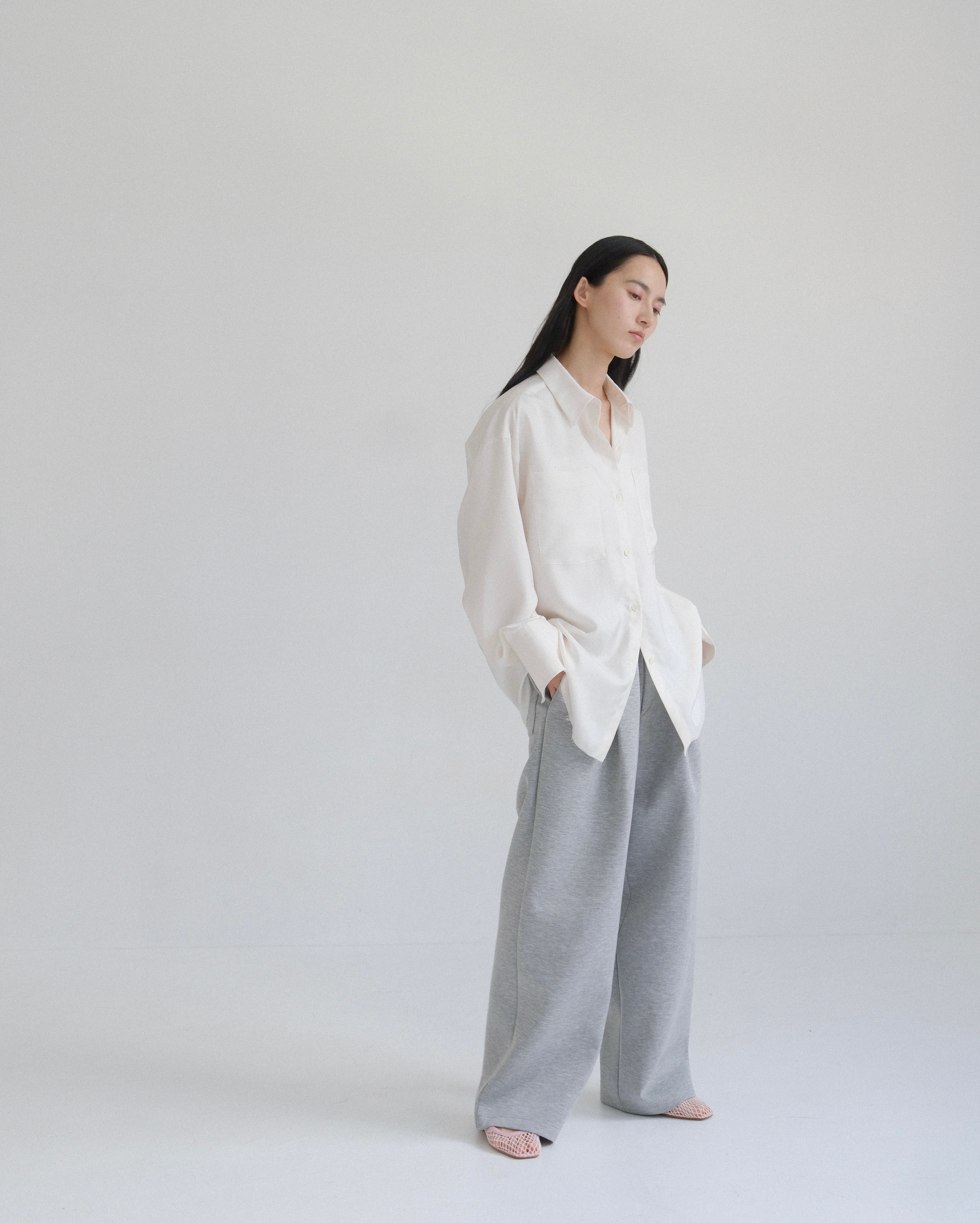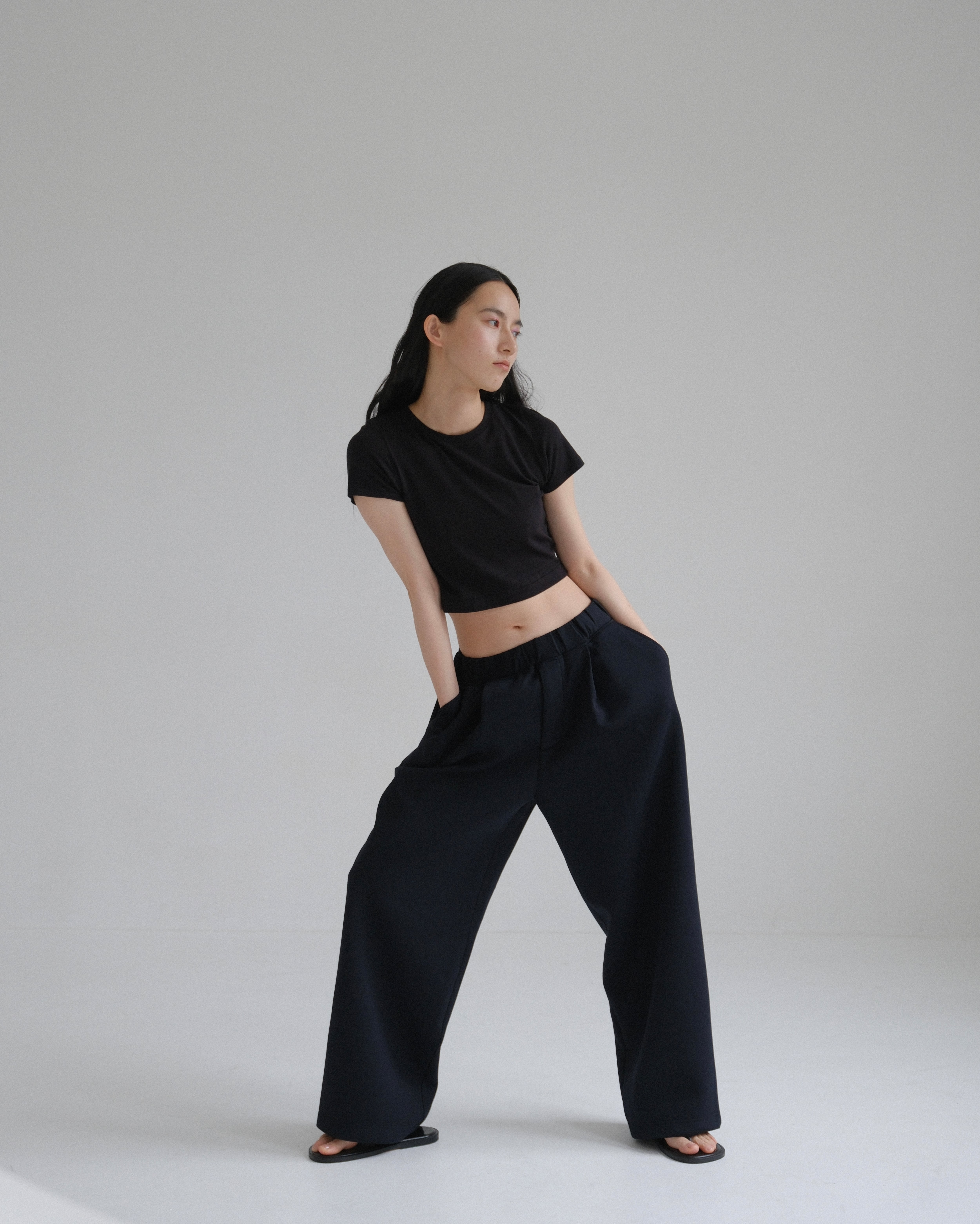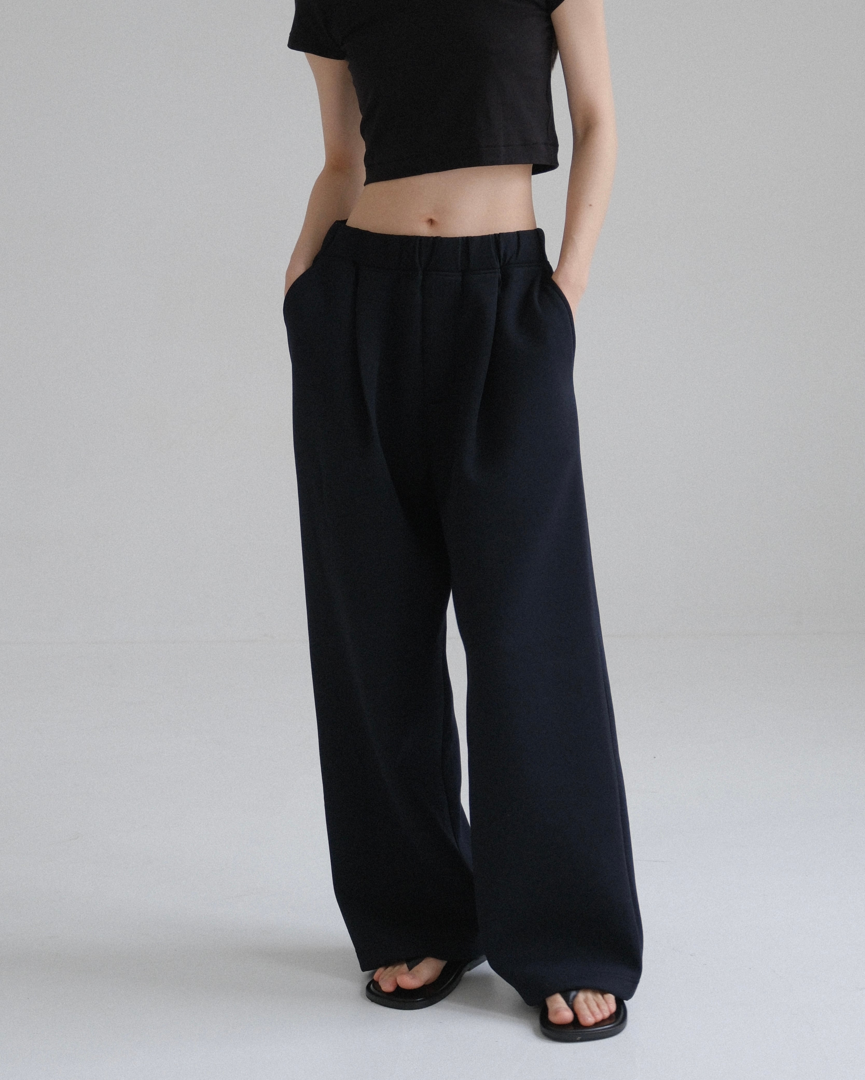 スウェットの気軽さと、スラックスのような佇まいをあわせ持つタックパンツ。