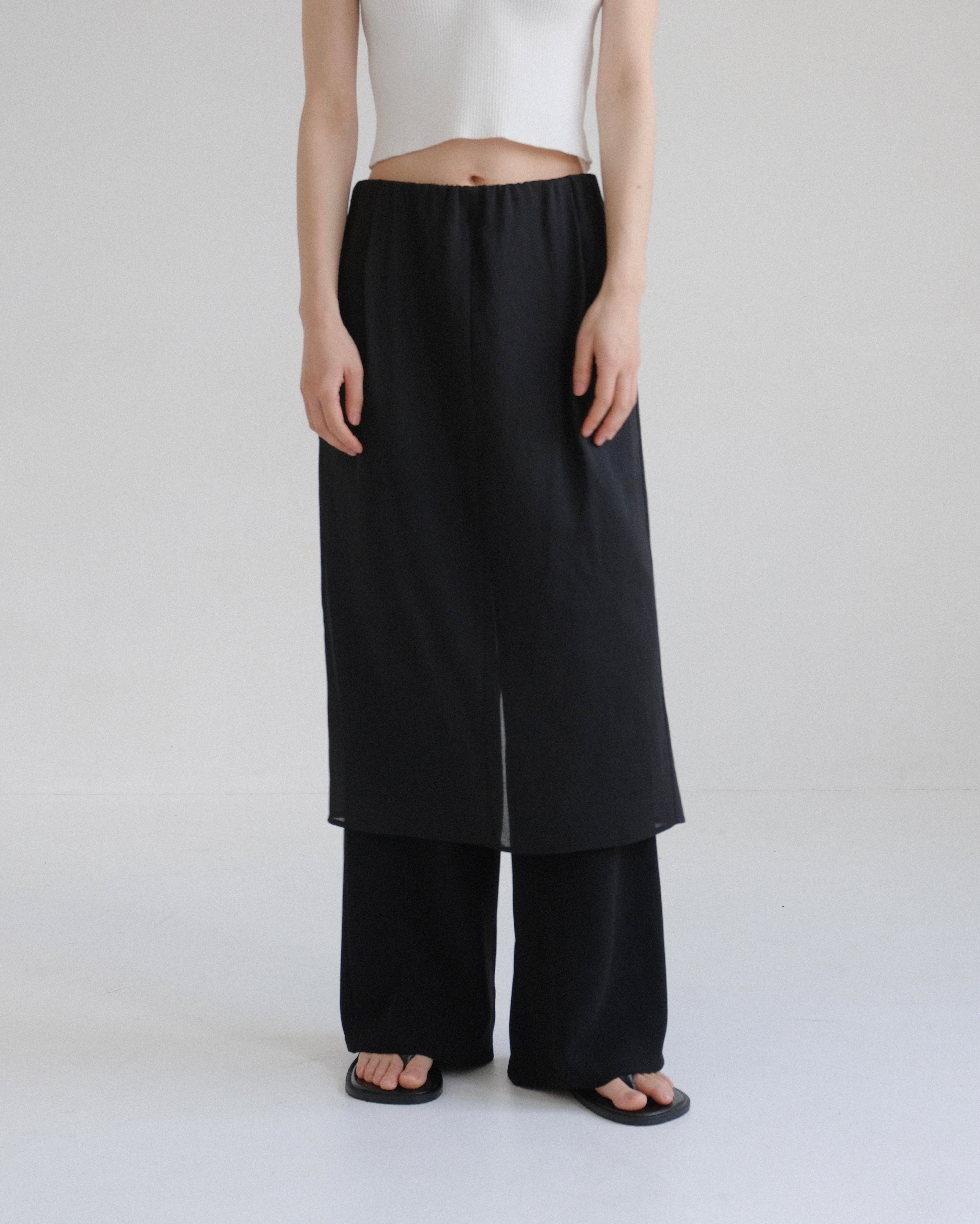 内側のワイドパンツに、ストレートシルエットのシアースカートを重ねたようなデザインで、動くたびにさりげない奥行きが生まれます。